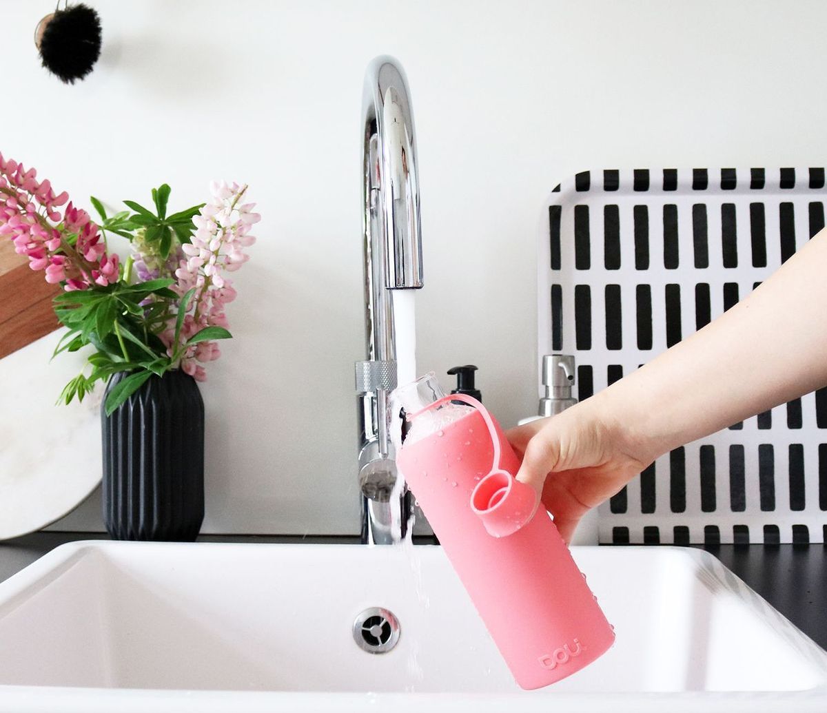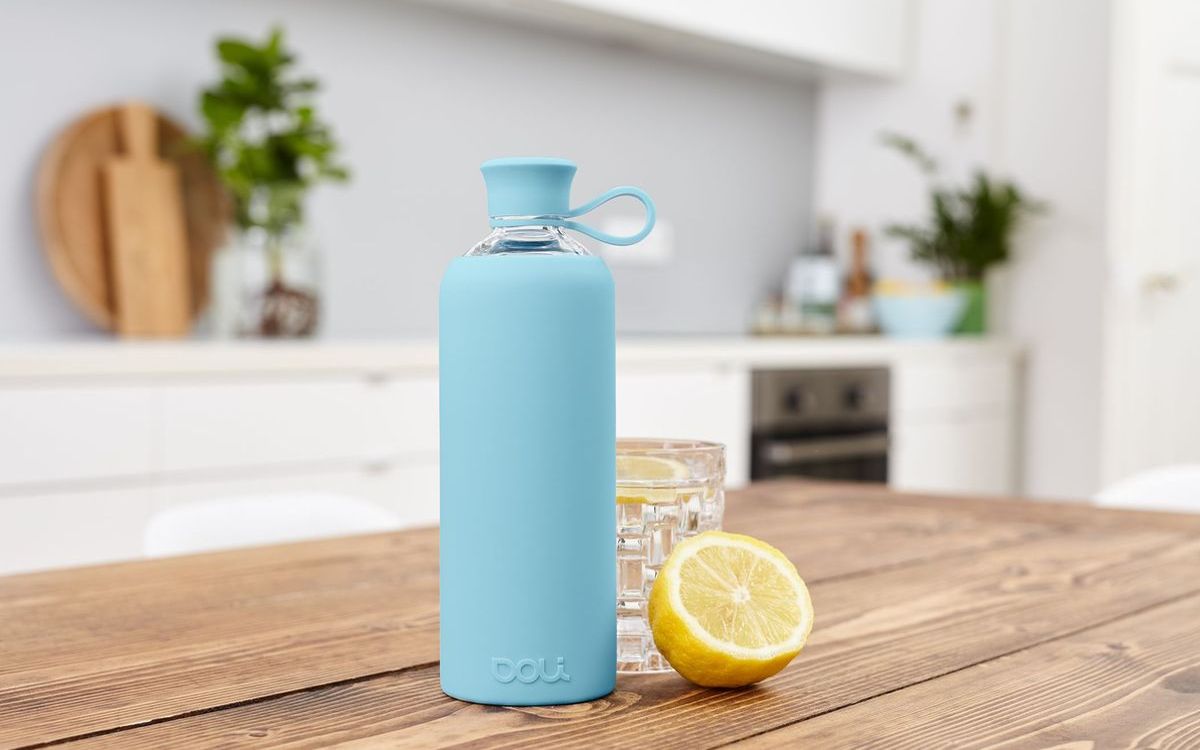 Jede der hier auf den Bildern gezeigten Flaschen von „Doli“ besteht aus handgefertigtem Borosilikatglas. Dazu gehört ein abnehmbarer, lebensmittelechter Silikonüberzug.