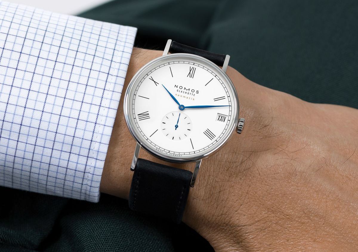 Dazu gehören die Dreiviertelplatine, die temperaturgebläuten Schrauben, der Streifenschliff oder auch das Nomos-Swing-System, das weltweit nur wenige Uhrenmacher anbieten können.
