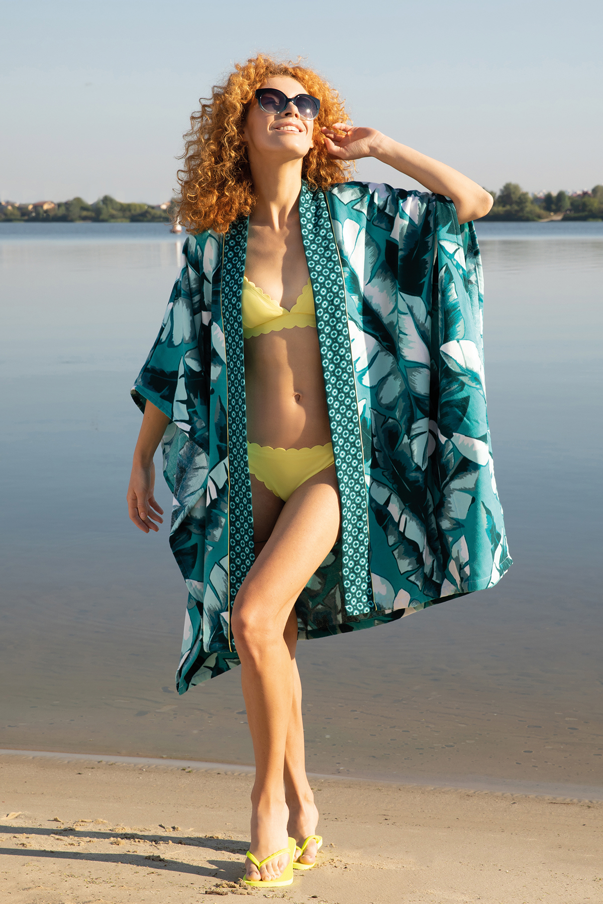 Der petrolfarbene Banana Leaf Print strahlt in brillanten Farben auf dem weichen, angenehm leichten Material. Die breite Blende mit Kontrastmuster wird zum Eyecatcher.