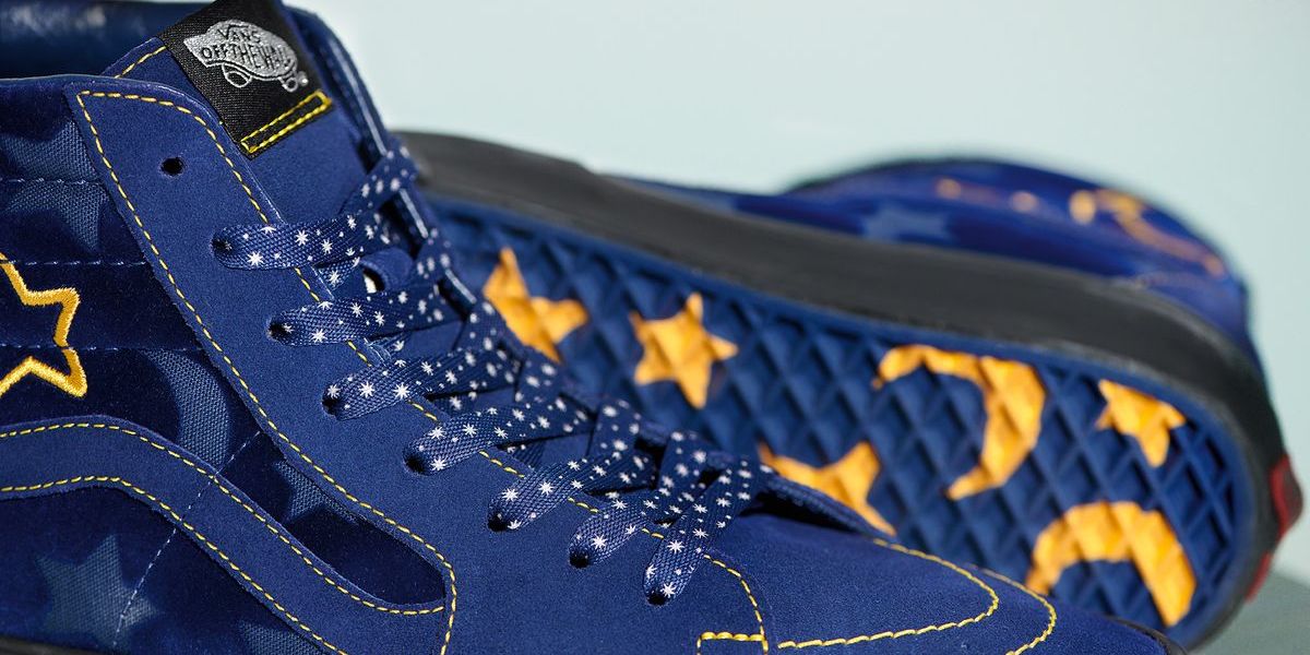 Das Ergebnis ist eine Auswahl an Schuhen, Kleidung und Accessoires. Der schelmische Charakterzug Mickeys kam 1940 durch den animierten Film Fantasia, in seiner Rolle als Zauberlehrling, ans Licht. In Anlehnung an den Hut des Zaubermeisters wurde das Sk8-Hi Modell fast vollständig in Samt gehalten und mit goldener Stern- und Mondstickerei verziert.