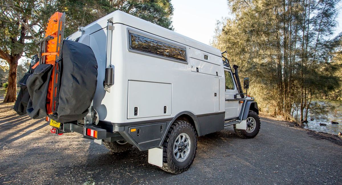 Am Heck des Wohnaufbaus montiert sind zwei Reserveräder und Bergehilfen. Klappen geben rechts und links im Heck den Zugang zu Stauräumen frei. Nach unten abgeklappt dienen sie als Tisch oder Ablage. Seitlich angeordnet ist außerdem ein Fach mit Außendusche und zur Befüllung des 250 Liter fassenden Frischwasservorrats. Ein anknüpfbares Duschzelt stellt die Privatsphäre auch bei der Körperpflege im Busch sicher. Vor allzu heftiger Sonneneinstrahlung beim Aufenthalt im Freien schützt eine Markise.