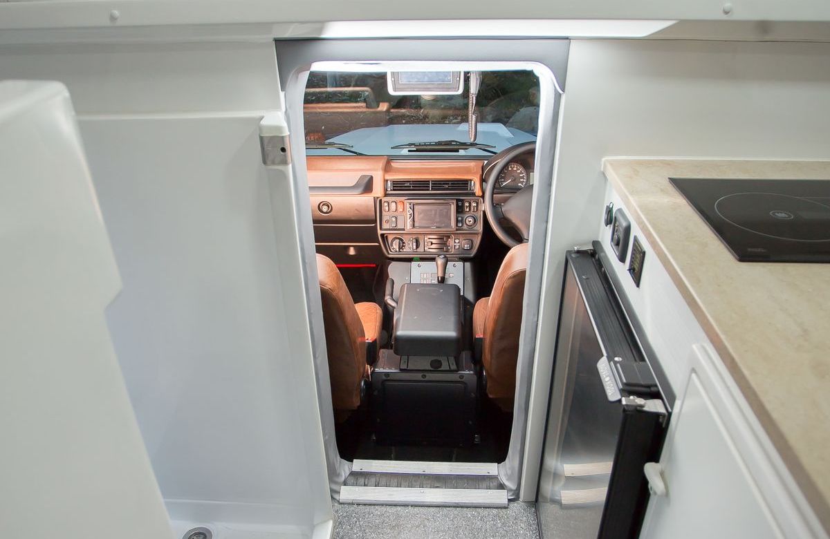 Den Zugang in die Wohnkabine gibt eine hinter der Fahrertür angeordnete Einstiegstür frei. Zwar gibt es einen schmalen Durchgang zwischen Fahrerhaus und Wohnkabine, der aber nur im Notfall genutzt wird. Der Earthcruiser Escape ist mit einer Duschtasse, einem einklappbaren WC und einem Küchenblock mit Diesel betriebenen Kochfeld, Spüle und Kühl- sowie Gefriergerät ausgestattet.