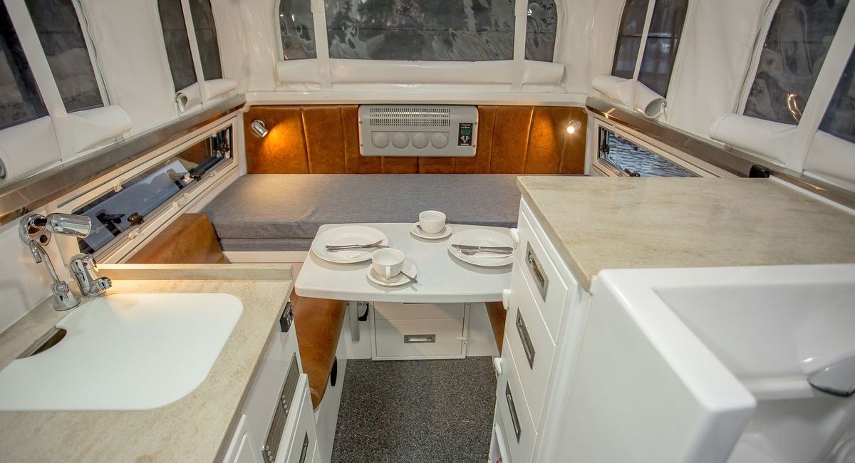 Im Heck befindet sich die kleine Sitzgruppe mit Tisch sowie eine quer über die Breite angeordnete Liege. Wird der Tisch abgesenkt, entsteht in diesem Bereich die für zwei bis drei Personen geeignete Liegefläche. Mit an Bord sind Klimaanlage und ein Touchscreen-Bildschirm zur Bedienung der Bord-Elektronik.