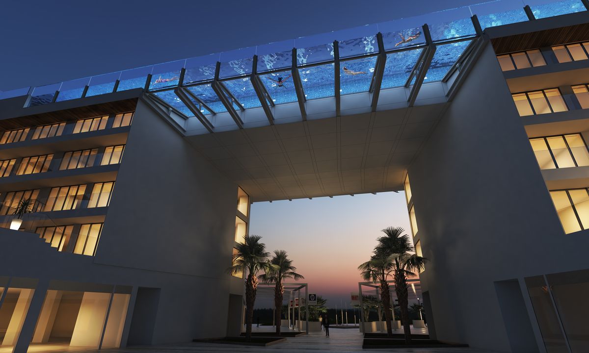 Hingucker des neuen Mallorca-Komplexes ist ein spektakulärer, zur rund 1.700 Quadratmeter großen Dachterrasse des Hotels gehöriger Pool mit gläsernem Boden, der zwischen Hotel und Einkaufszentrum hängt.