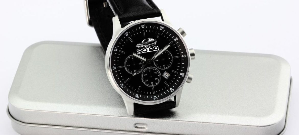 Die besondere Armbanduhr aus der „Classic Ride Edition“ kommt mit sportlich-markantem Design samt XL-Edelstahlgehäuse und 43 Millimeter Durchmesser. Highlight ist das schwarze Zifferblatt mit weißem „Ro 80“ Logo, das eine Illustration dieses damals innovativen Gefährts zeigt.