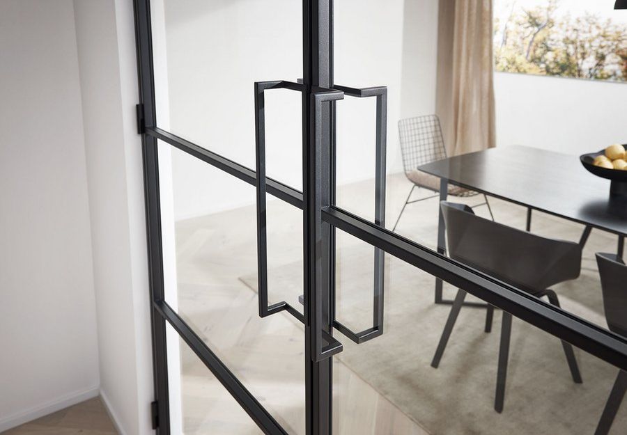 Materialien wie Stahl und Glas spielen bei der Inneneinrichtung des Lofts eine prägende Rolle, insbesondere bei den Raumtüren.