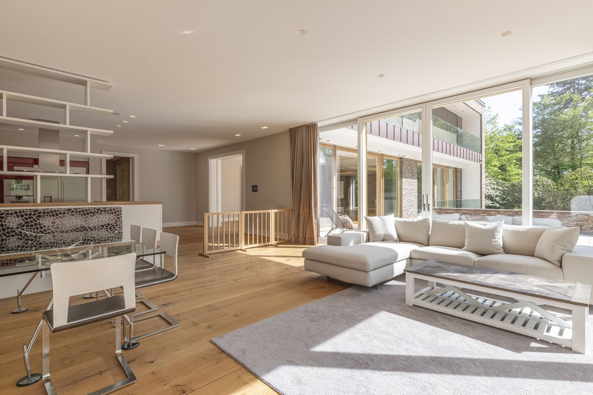 Dinesen-Eichendielen, raumhohe Fenster und eine elegante Galerie schaffen ein einzigartiges Raumgefühl, das die Verbindung von Design und Natur perfekt inszeniert.