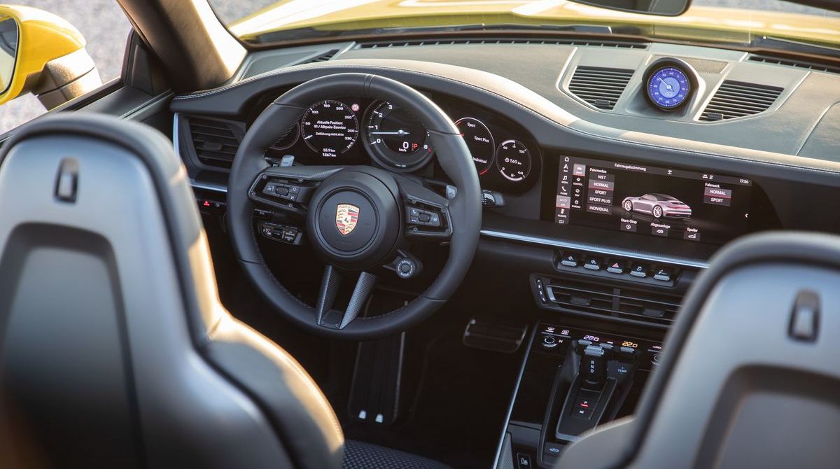 Innenraum: Gerade im Sportwagenbereich findet man selten einen Innenraum, der im Detail optisch und haptisch so sorgfältig gestaltet wirkt. Vieles ist wie früher. Symbole dafür: Zündschloss links und zentraler großer Drehzahlmesser. Die Bedienung fürs Dach und für das Windschott sitzen in der klavierlackglänzenden Mittelkonsole griffbereit am Ende, damit die zwölf Sekunden nicht durch langes Suchen verlängert werden. Auch das Cabrio verfügt über zwei Notsitze und Porsche schwört, die gehörten auf Dauer zur DNA eines 911ers. Ebenso wie der nur 134 Liter große Kofferraum.