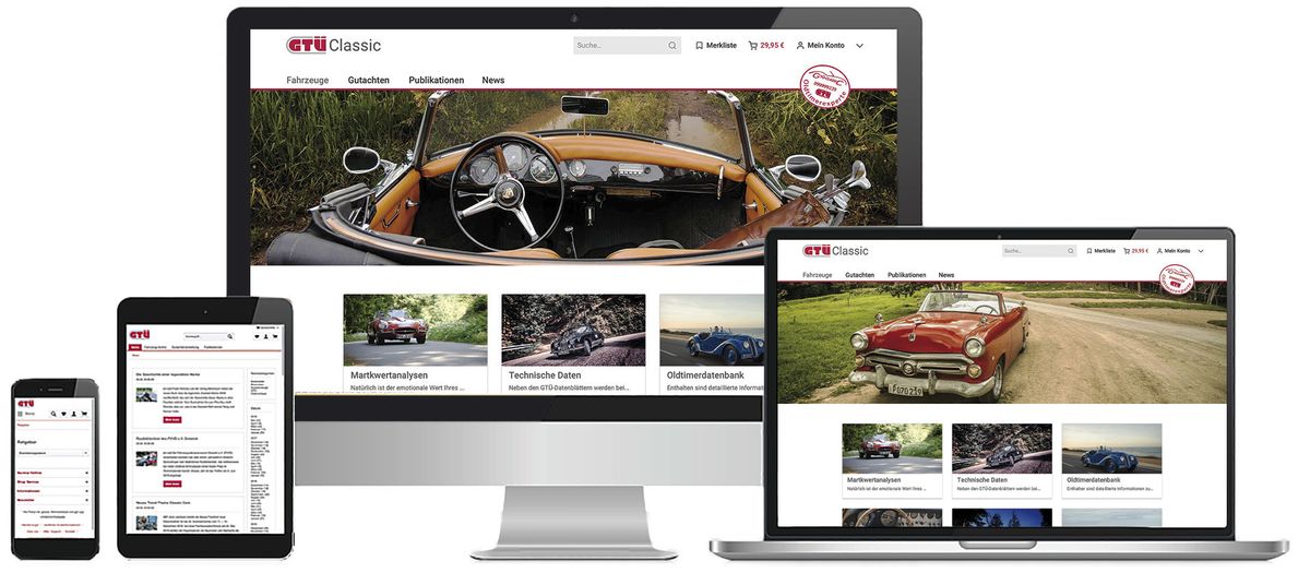Neben aktuellen Branchennachrichten bietet das Oldtimer-Portal gtue-classic.de eine umfangreiche Fahrzeugdatenbank. Zusätzlich unterstützt die Website beispielsweise auch bei Fragen zur Fahrzeugzulassung von Old- und Youngtimern, historischen Nutzfahrzeugen und Motorrädern sowie bei Gutachten.