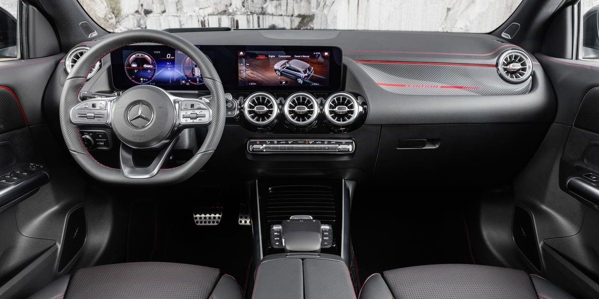Im Innenraum charakteristisch sind die Sitzbezüge in Ledernachbildung in Schwarz mit roter Kontrastnaht und roten Gurten. Beim MBUX Infotainmentsystem unterstreichen emotionale Inszenierungen die Verständlichkeit der Bedienstruktur.
