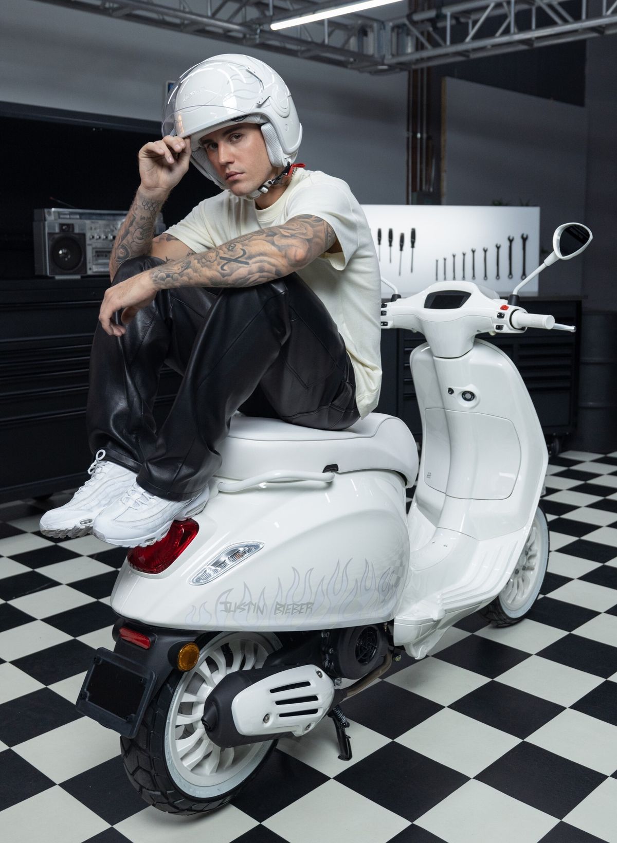 Justin Bieber gestaltete mit Vespa jetzt die Roller-Kollektion namens Justin Bieber x Vespa. Die Farbe Weiß, die der Sänger dafür wählte, findet sich bei allen Komponenten dieser Vespa Sprint.
