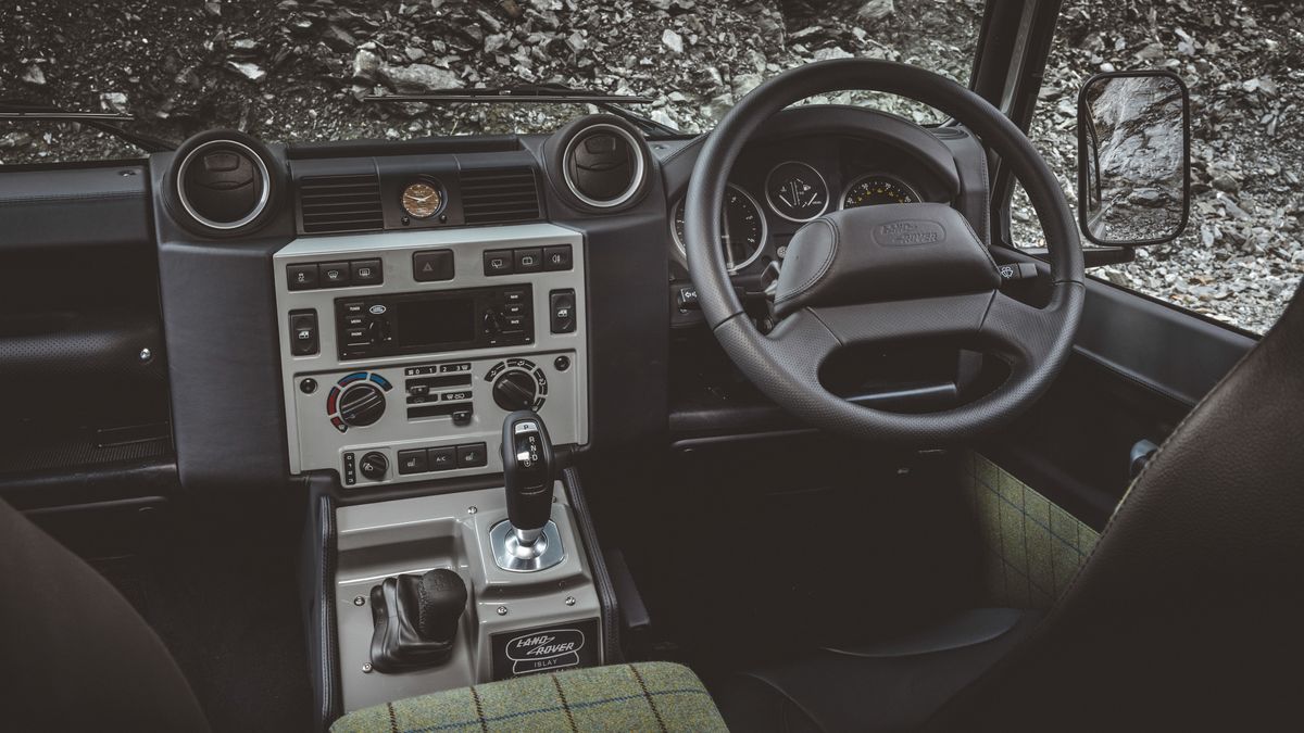 So finden sich am grau lackierten Classic Defender Works V8 Islay Edition ein Dach in Limestone und Schwerlast-Stahlfelgen. Ausgekleidet ist das Interieur in Leder sowie mit Tweed-Details aus der Produktion der Wollmühle Islay Wollen Mill, die speziell für das Editionsmodell ausgewählt wurden.