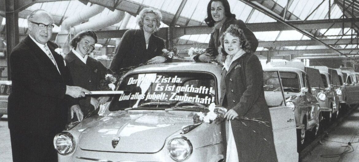 Der erste NSU Prinz fährt im März 1958 vom Band. Auf dem kleinen Auto liegen große Hoffnungen der damals rund 6.500 Mitarbeitenden.