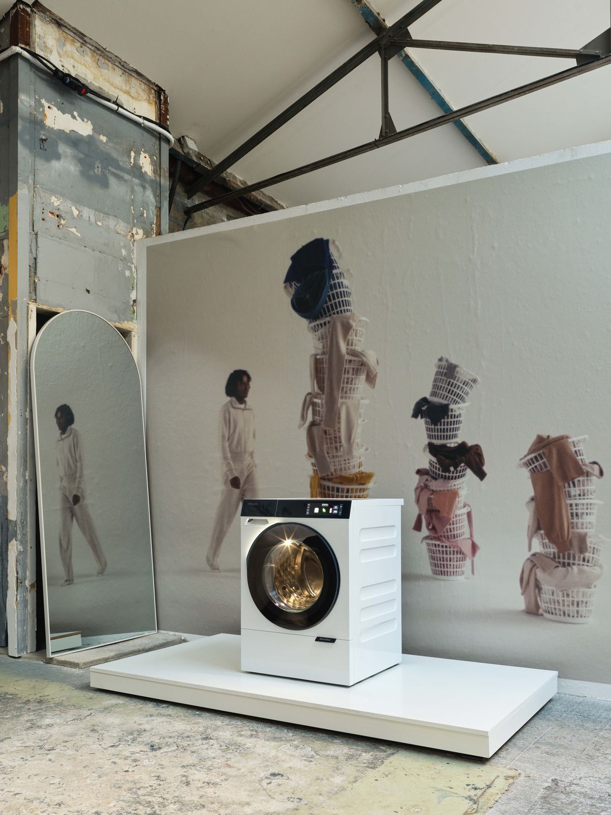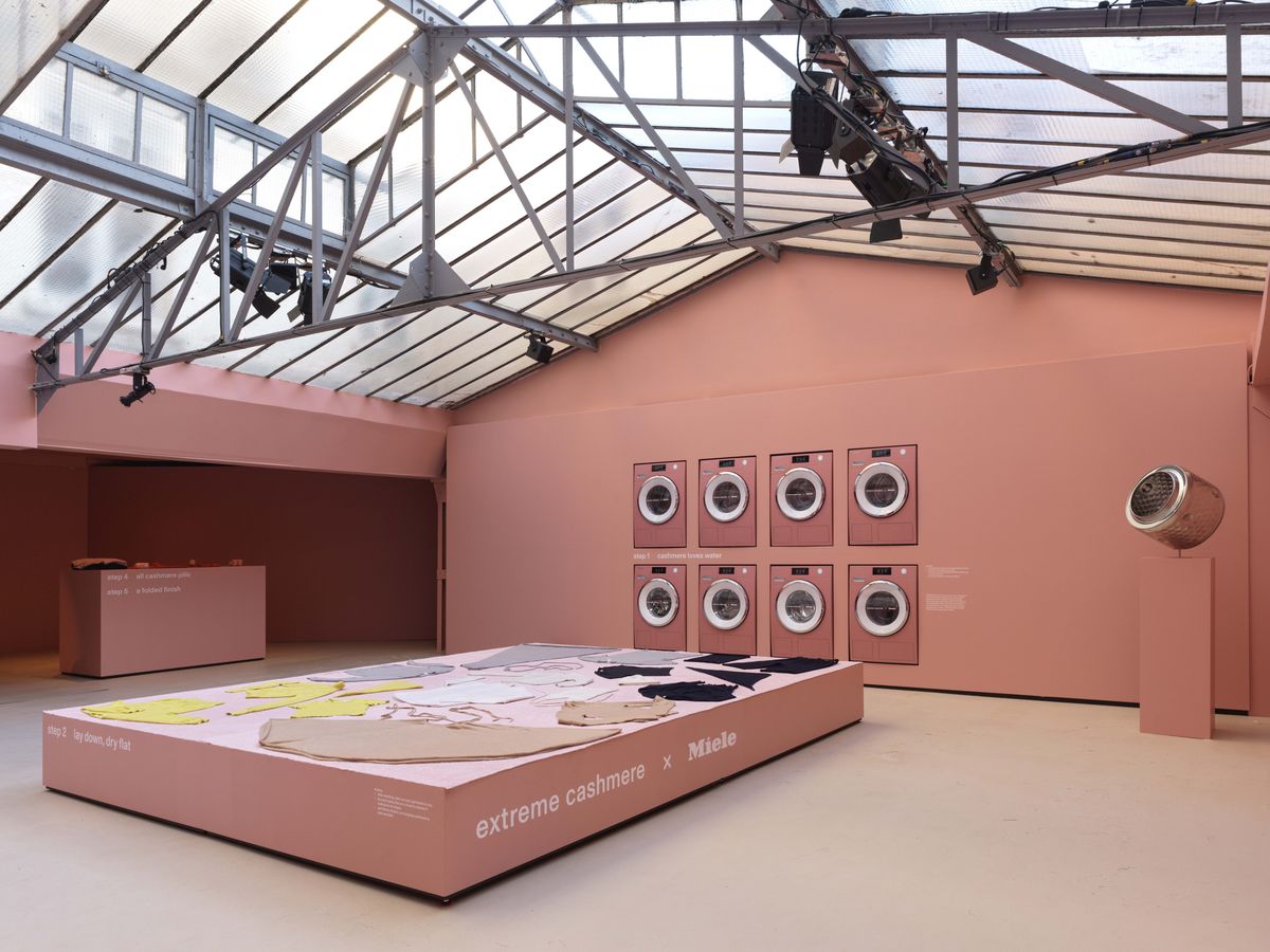 Die Installation zeigte in fünf Schritten, wie sich Kaschmir-Textilien optimal pflegen lassen: waschen, trocknen, bügeln, pflegen und falten. Gewaschen wird bei 30 °C und maximal 600 Umdrehungen pro Minute im speziellen Wollwaschprogramm von Miele.