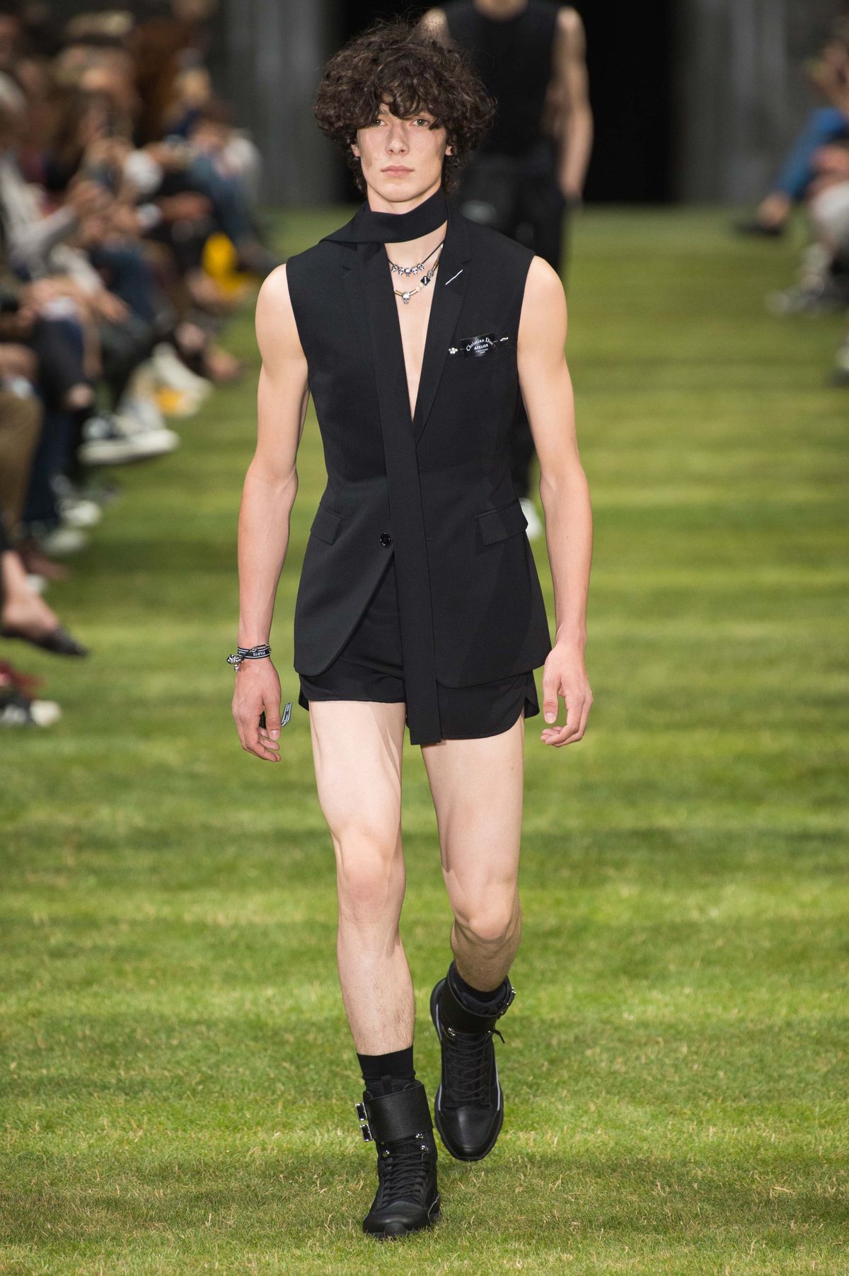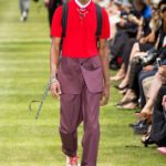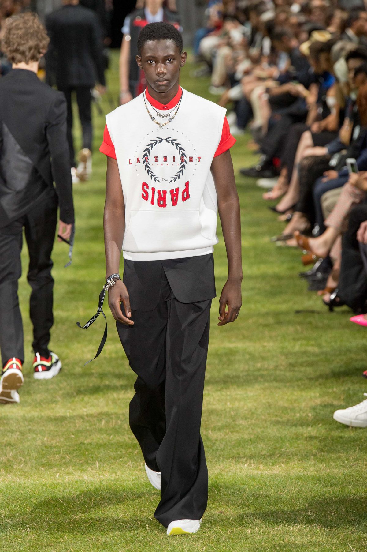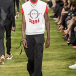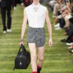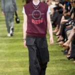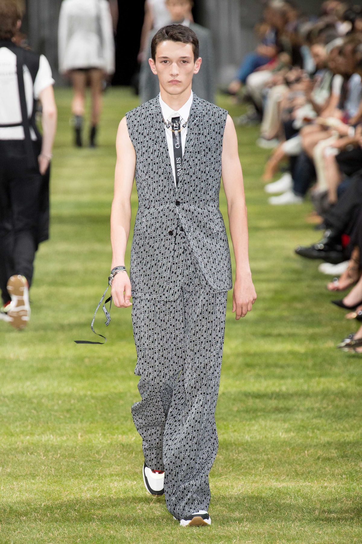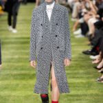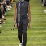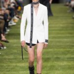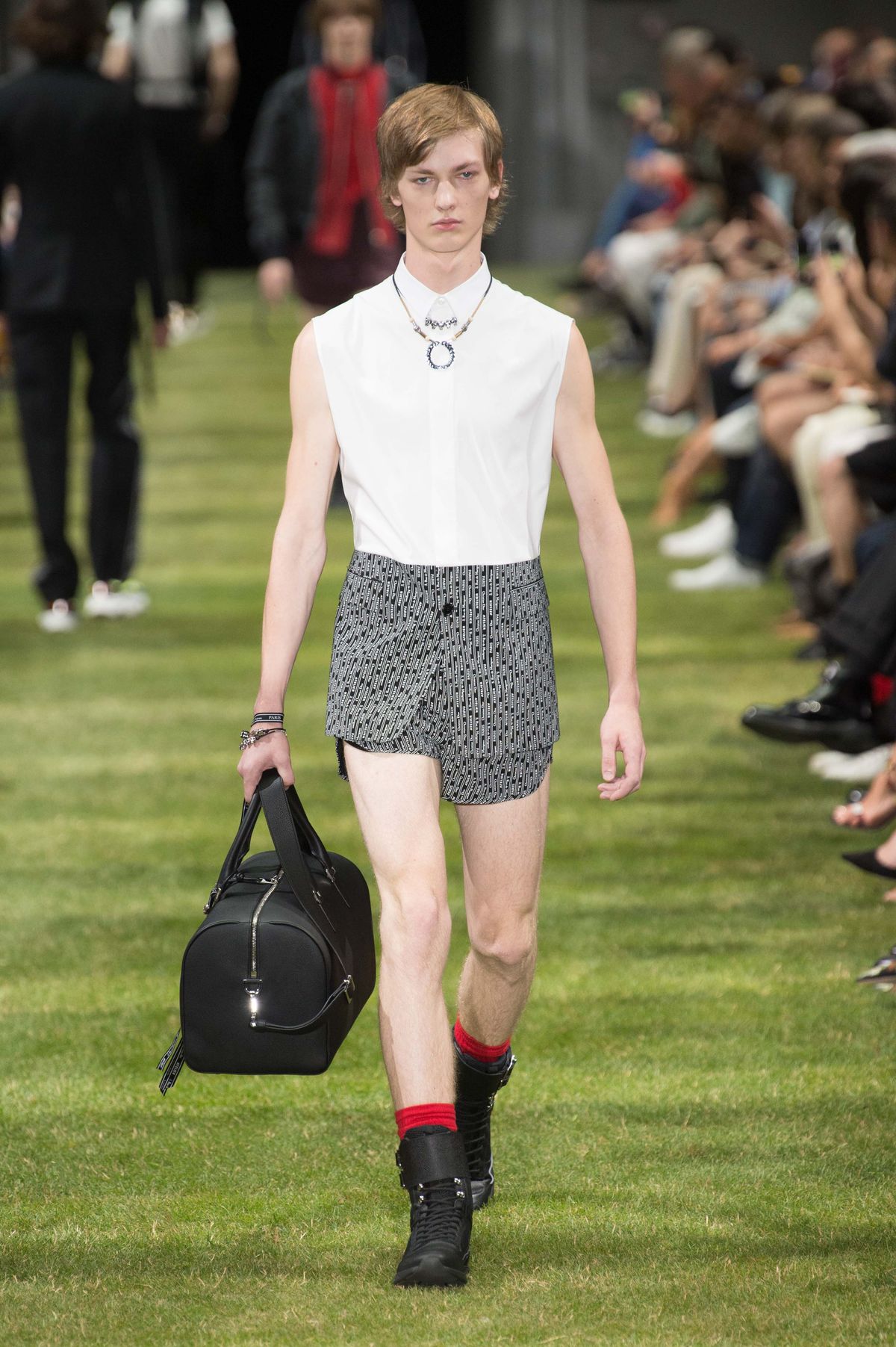 Uni-Elemente sind mit dem feinen Anzug verschmolzen. Van Assche sagte selbst, er stelle sich hierbei Schulkinder im Urlaub vor, die an ihren Uniformen herumbasteln und die Kleidung ihres Vaters stehlen. Hier trifft Sport auf Eleganz.