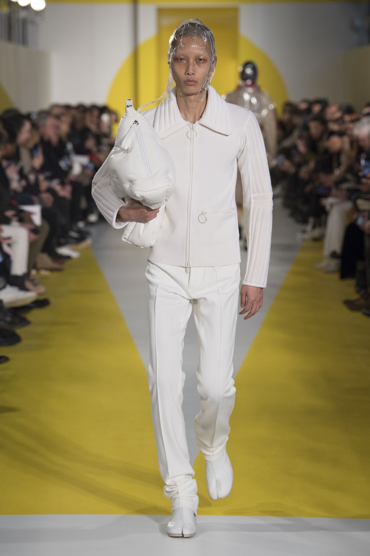 Die Show präsentiert sich vor dem Hintergrund einer Synergie aus Hieroglyphen und formt damit ein neues Symbol, das eine positive Botschaft für das Modehaus aussendet. Es findet seinen Widerhall im aus mehreren Teilen ausgeschnittenen und wieder zusammengesetzten Makintosh Mantel. Bekannt als SMS, debütiert der Security Margiela Sneaker.