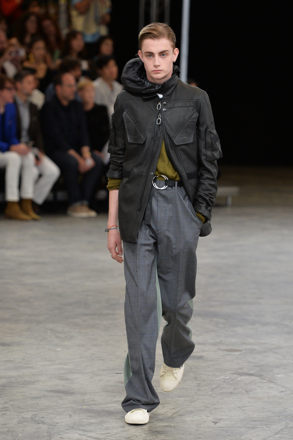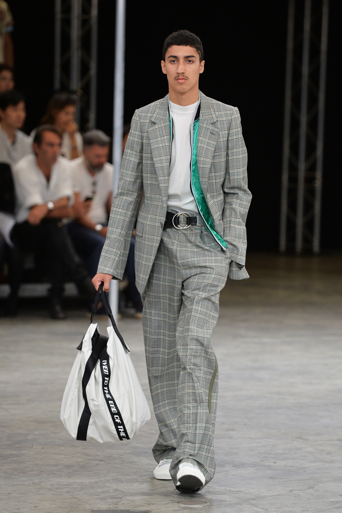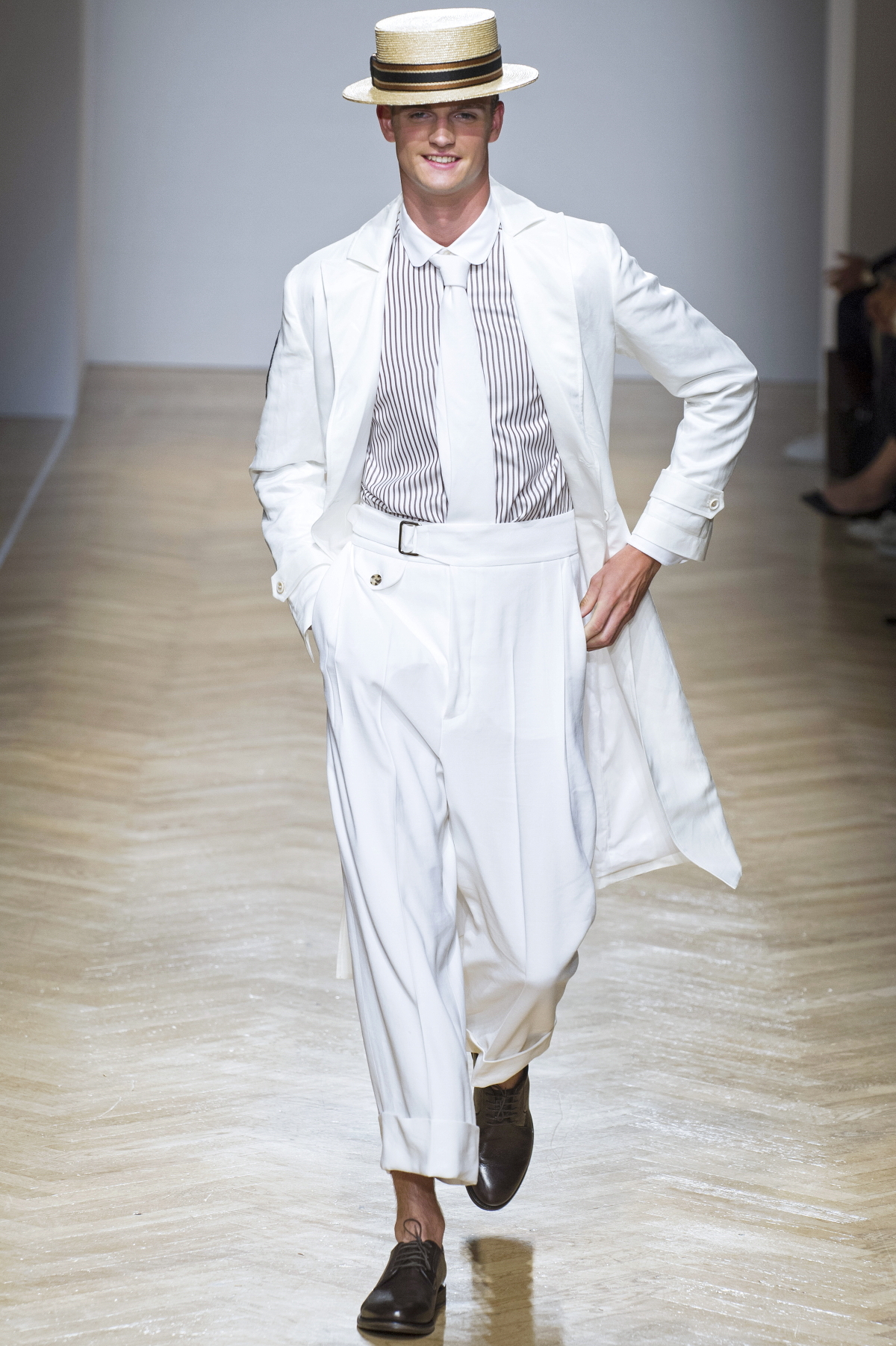 Daks zeigt während der Fashion Week in Mailand ein kürzeres Modell, das durch den weißen Stoff und die Kombination mit dem legeren Trenchcoat ein perfektes Herbstoutfit darstellt.