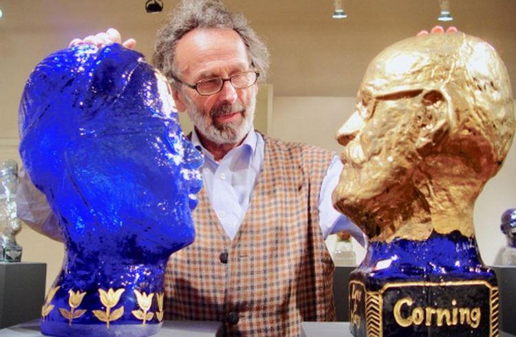 Auf dem Foto: Das Bild zeigt Erwin Eisch mit zwei Glasköpfen, die er zu Ehren seiner beiden Künstlerfreunde Harvey K. Littleton und Thomas S. Buechner angefertigt hatte.