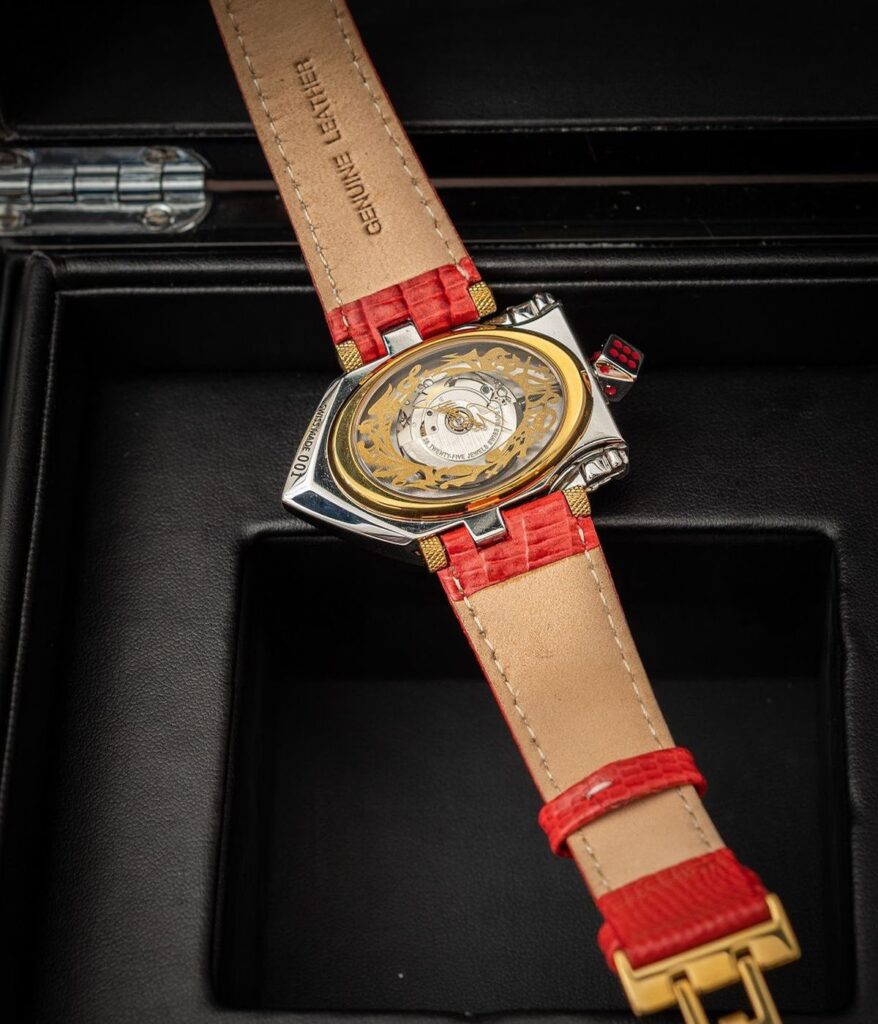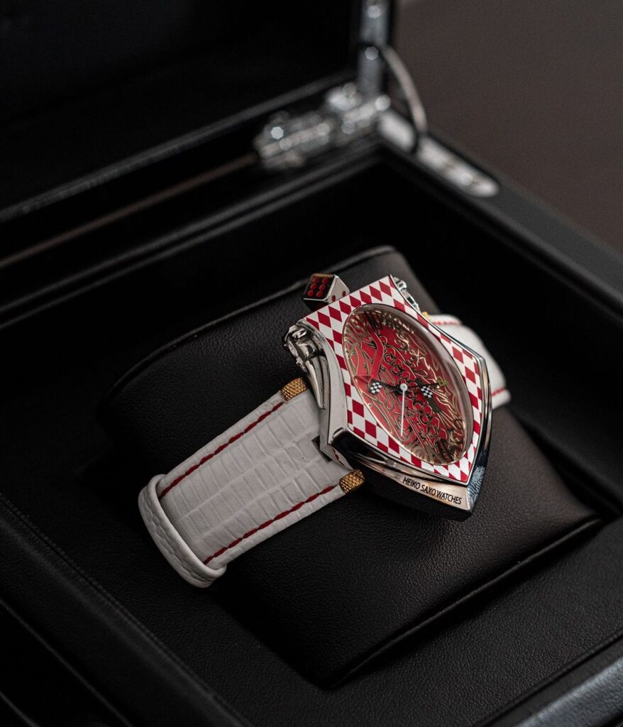 Heiko Saxo versetzte das Art-Deco-Design in eine symbolträchtige „Lucky Watch“ – mit Edelstahl-Spielerwürfel als Krone und zwei Formel 1 Designerboliden an den Flanken des gewölbten Gehäuses.