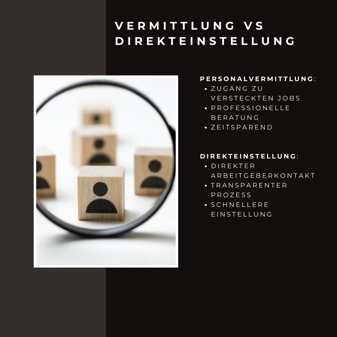 - Direkteinstellungen bieten direkten Kontakt mit Arbeitgebern, transparente Prozesse und manchmal schnellere Entscheidungen. Allerdings ist der Zugang zu Stellenangeboten begrenzter, und es erfordert mehr Eigenaufwand bei der Jobsuche.