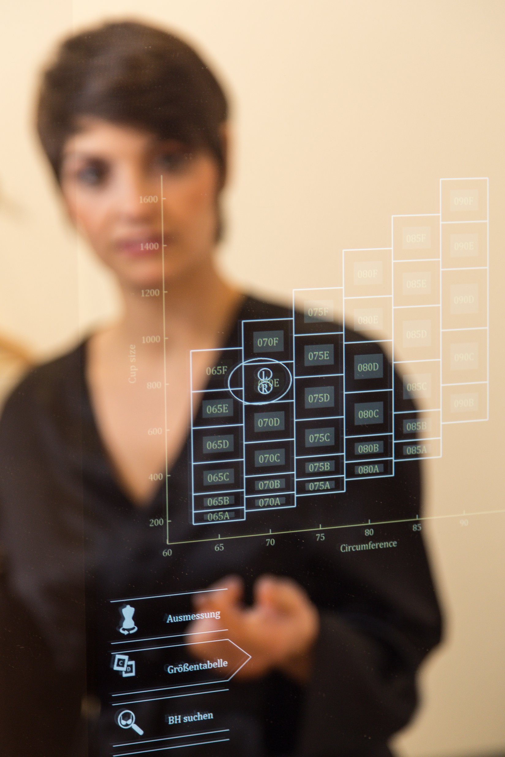 Er sieht aus wie ein gewöhnlicher Umkleidekabinen-Spiegel, in der Wand versteckt sitzt jedoch eine ausgefeilte 3D-Vermessungstechnologie, mit deren Hilfe die Kundin ihre perfekt passende BH-Größe herausfinden kann.