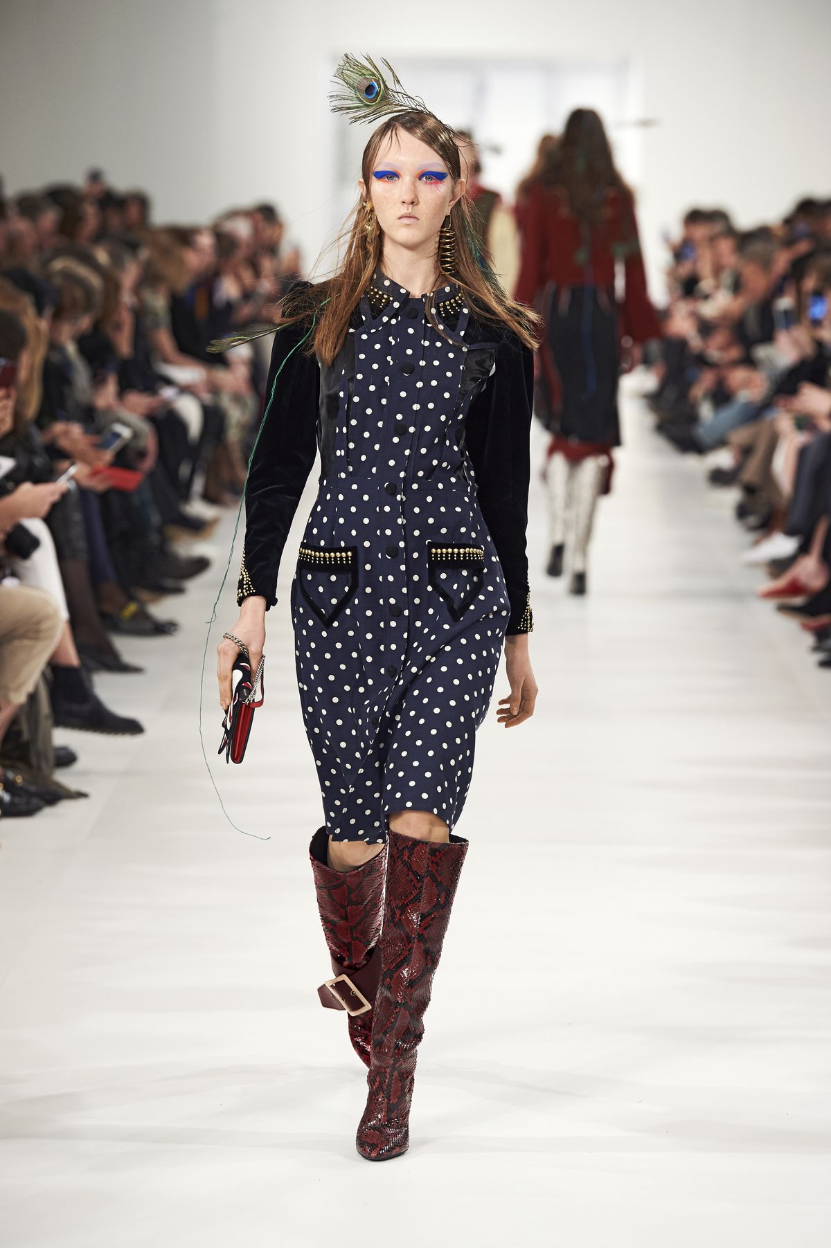 Ganz nach dem Motto „mehr ist mehr“ spart Galliano auch nicht mit Polka Dots, Tapisserie-Drucken, Blumenprints und Hahnentrittmustern. Einige Models tragen Pfauenfedern, Garn sowie überdimensionale Haarclips im Haar.