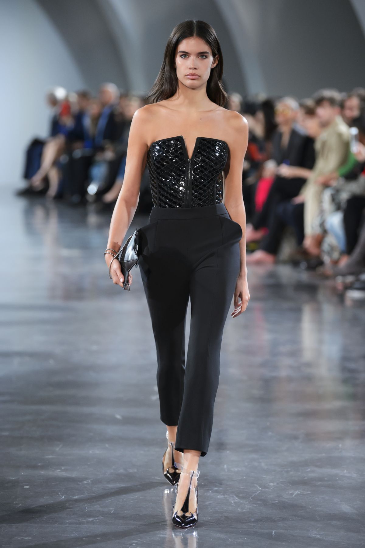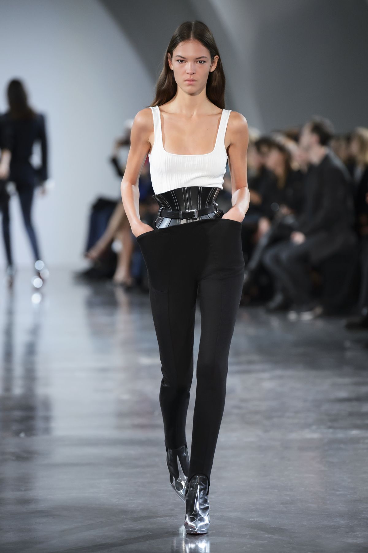 Die Korsetts zaubern eine hinreißende Wespentaille. Der grazile Schnitt ist kurz gehalten – Zigarettenhosen schmiegen sich an die Taille und grafische Blazer zeigen die für Mugler charakteristische geformte Schulter. Die Farbpalette verkörpert das Zusammenspiel von heiß und kalt. Schwarz und strahlendes Weiß prallen auf intensives Gelb, Koralle, Sand und ein blasses Blau.