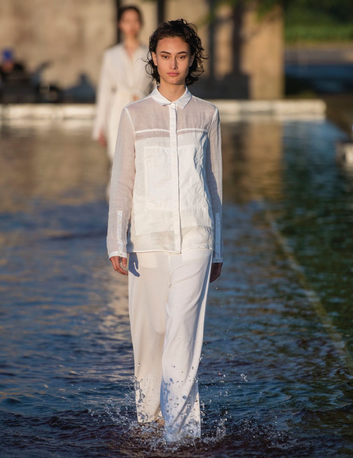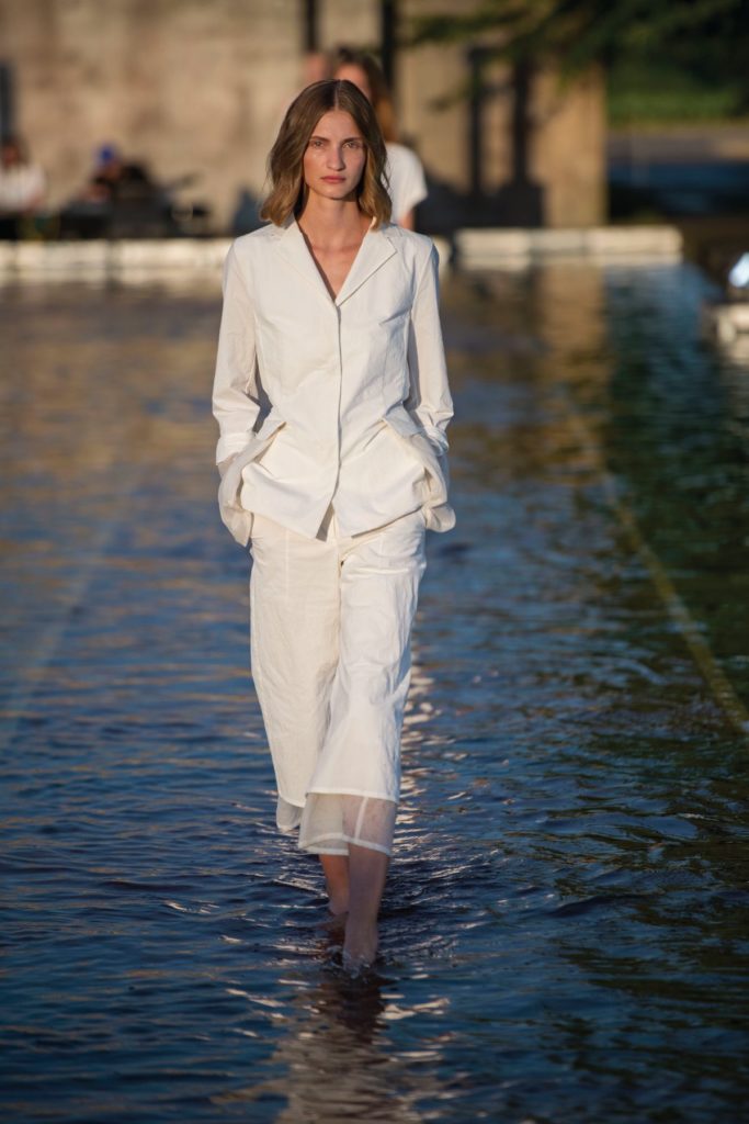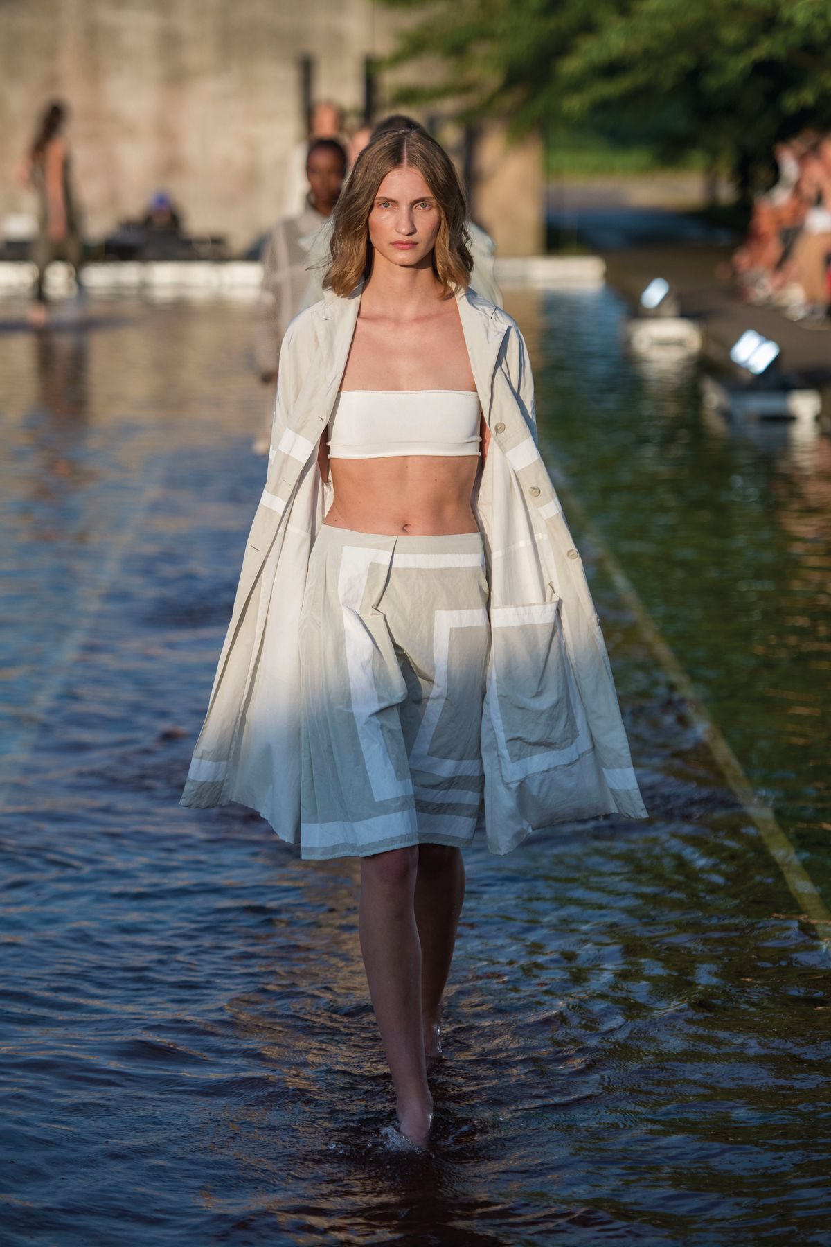 Trotz wechselhaften Wetters, Regenschauer und Gewittervorhersage vertraute die Designerin auf ihre Intuition. Und eine Stunde vor Showbeginn klarte der Himmel über Neuss auf. Begleitet von Sonnenstrahlen schwebten Models im minimalistischen Ambiente über den Spiegelteich.