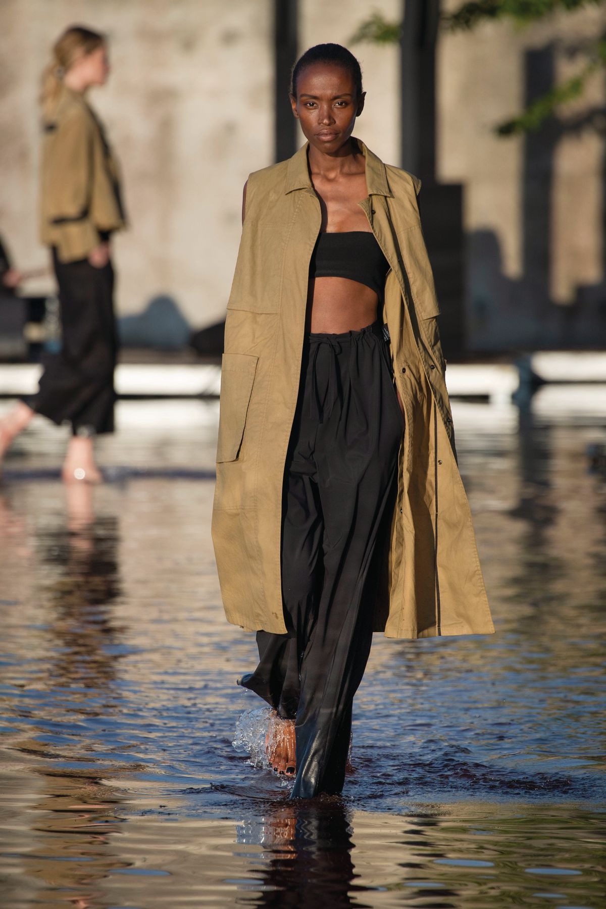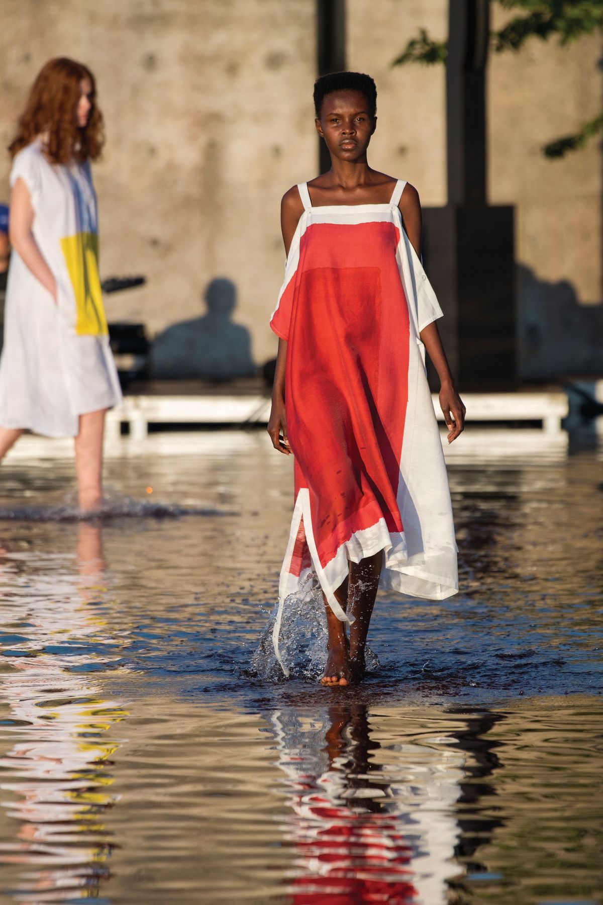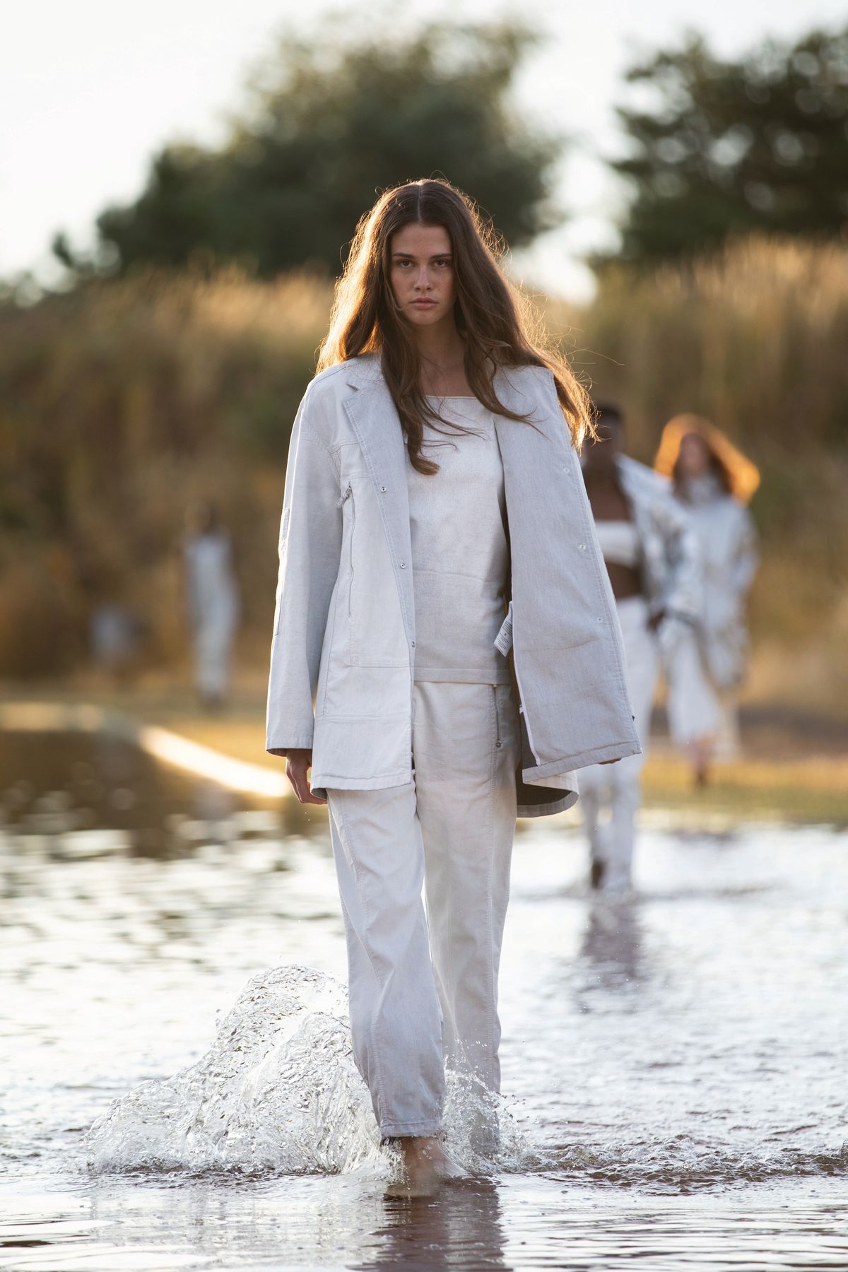 Trotz wechselhaften Wetters, Regenschauer und Gewittervorhersage vertraute die Designerin auf ihre Intuition. Und eine Stunde vor Showbeginn klarte der Himmel über Neuss auf. Begleitet von Sonnenstrahlen schwebten Models im minimalistischen Ambiente über den Spiegelteich.