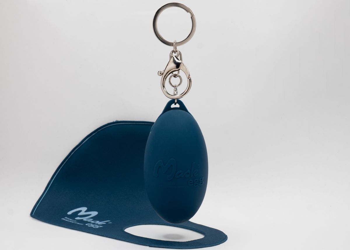 Maskegg ist ein kompaktes Ei aus Silikon und hat dieselbe Farbe wie die Unisize-Maske, die darin enthalten ist. Durch den Schlitz kann man den Mund-Nasen-Schutz entnehmen, aufsetzen und nach Gebrauch wieder hineinstecken.