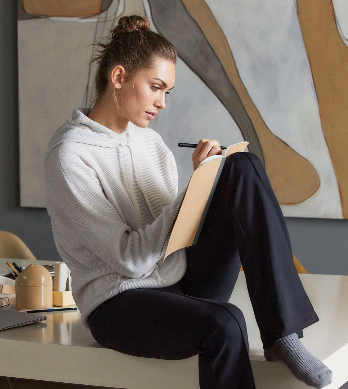Diese Homewear-Looks sollen modische Wohlfühl-Items sein. Weiche Strumpfhosen – zum Beispiel in Beige oder Hellgrau – schmiegen sich an wie eine zweite Haut.