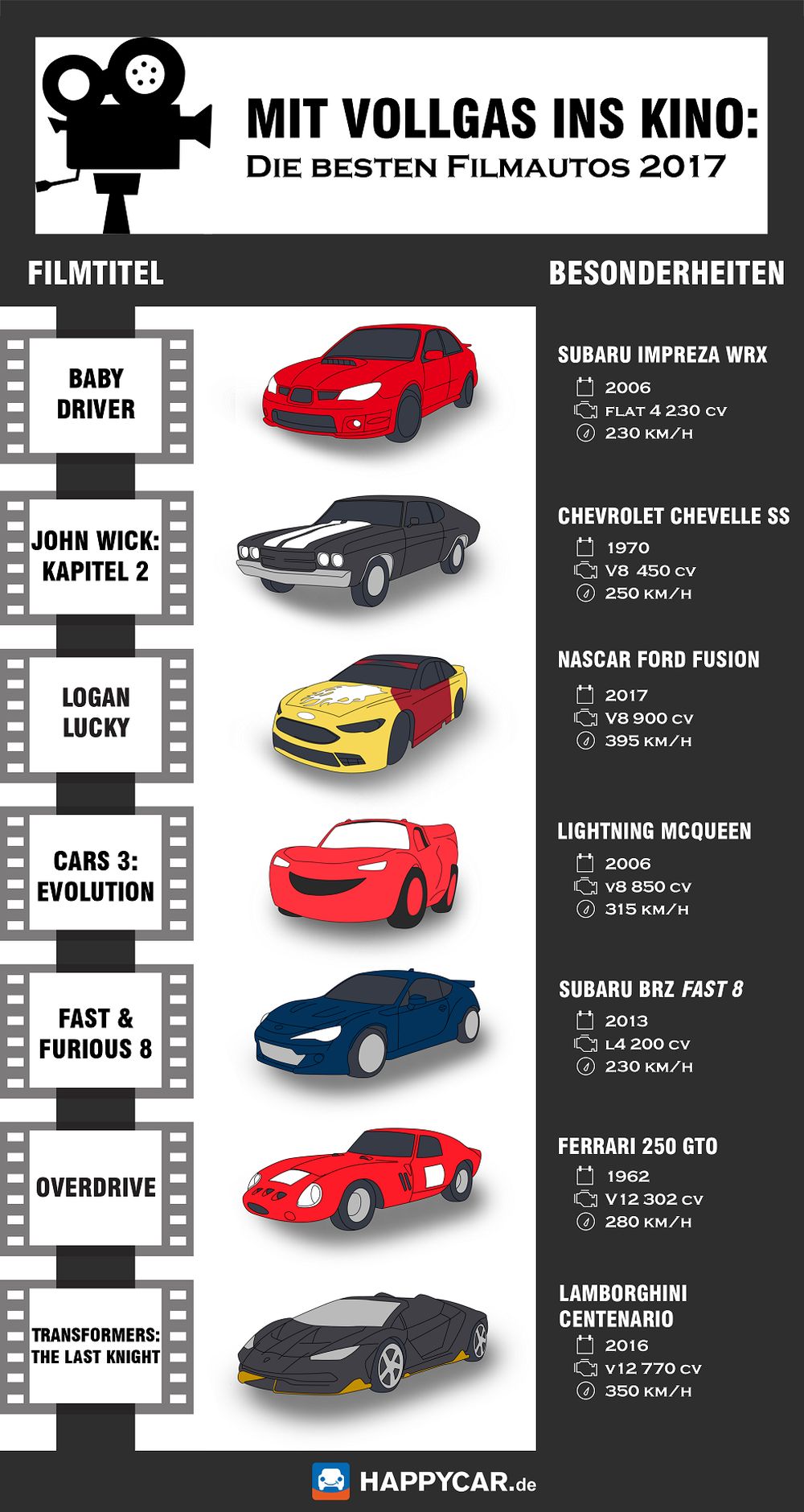 Aktuelle Sportwagen, Klassiker und Spezialfahrzeuge hatten im Kino ihre großen Auftritte. Hier ist eine Übersicht als Infografik, die HappyCar für uns erstellt hat. Denn dort wurden die Blockbuster des Jahres nach den besten Filmautos abgesucht.