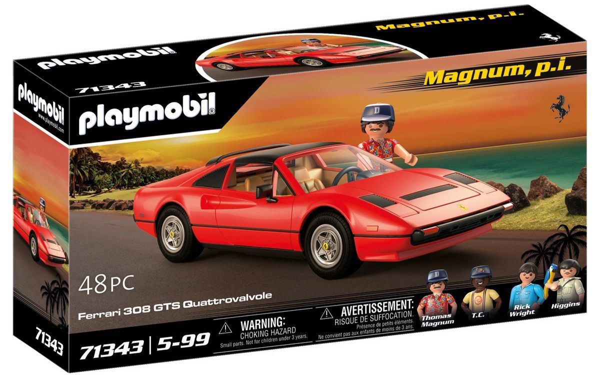 Kult-Spielzeugmarke trifft Kult-Detektiv: Playmobil hat Magnum aus der gleichnamigen Erfolgs-Fernsehserie „Magnum P.I.“ der 1980er Jahre mit Hauptdarsteller Tom Selleck samt seines geliebten roten Ferrari 308 GTS Quattrovalvole aufgelegt.