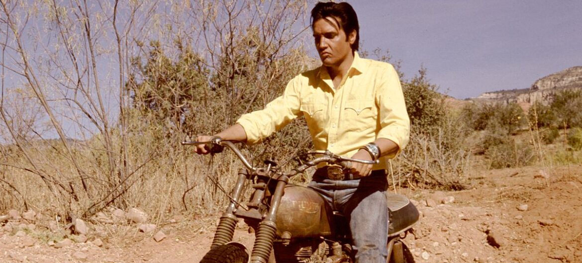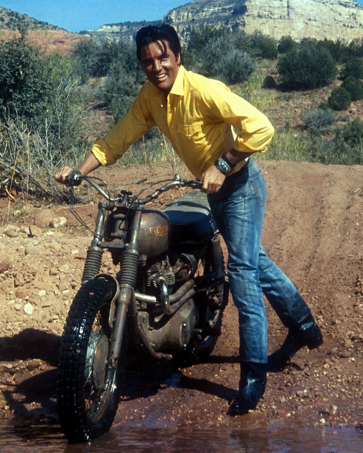 Als leidenschaftlicher Biker fuhr „The King“ of Rock’n’Roll in vielen seiner über 30 Filme nämlich Motorrad, etwa in der Komödie „Stay Away Joe“ (1968) unter anderem eine Triumph 650 Bonneville „Desert Sled“ in Rot und Silber.