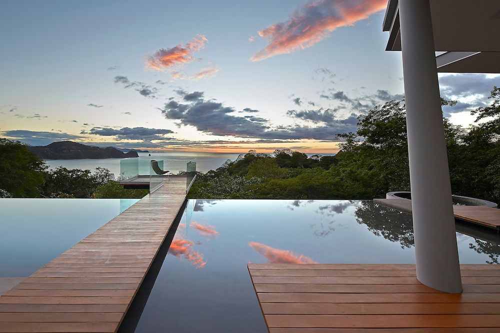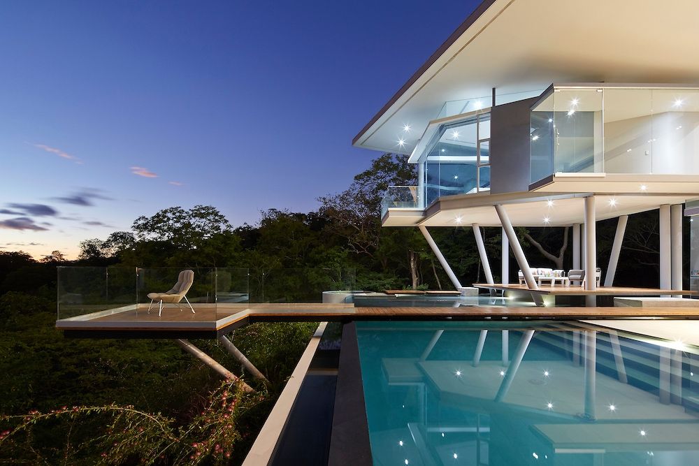 Das an einem bewaldeten Hang an der Küste Costa Ricas stehende, 4,8 Millionen Euro schwere Einfamilienhaus wurde von Architekt Victor Cañas entworfen. Die großen, imposanten Glasfronten erstrecken sich über alle Stockwerke und ermöglichen einen atemberaubenden Weitblick auf den Pazifik und den angrenzenden Wald.