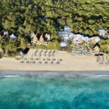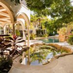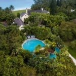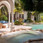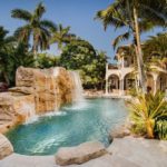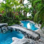 Schwimmen unterm Wasserfall? Dieser Pool macht’s möglich. Umliegende Palmen betten das Schwimmbecken aus Naturstein ein und spenden Schatten.