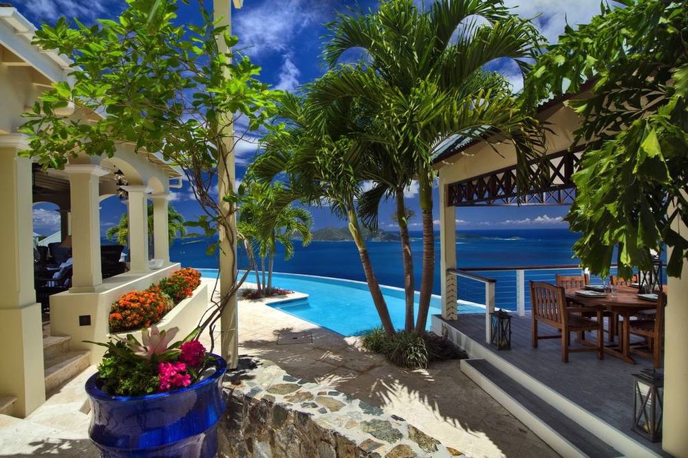 Es scheint, als fließe das Wasser des Pools direkt in den Ozean. Für absolute Ruhe und Entspannung sorgt die abgeschiedenen Lage des Anwesens auf den Britischen Jungferninseln. Die Grundstücksfläche umfasst 12.500 Quadratmeter und lässt keine Wünsche offen.