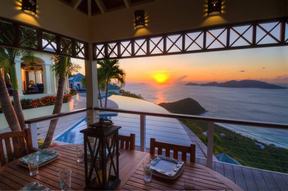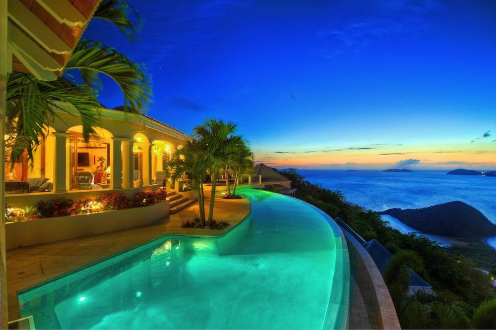 Auf einer Hügelkette der Insel Tortola gelegen, thront ein luxuriöses Einfamilienhaus der Extraklasse. Die 4,7 Millionen Euro teure Luxusimmobilie besticht durch ihren traumhaften Ausblick – und den beleuchteten Infinity Pool. Das kantenlose Schwimmbecken schlängelt sich entlang der Veranda und ermöglicht einen uneingeschränkten Rundumblick auf die atemberaubende Natur.