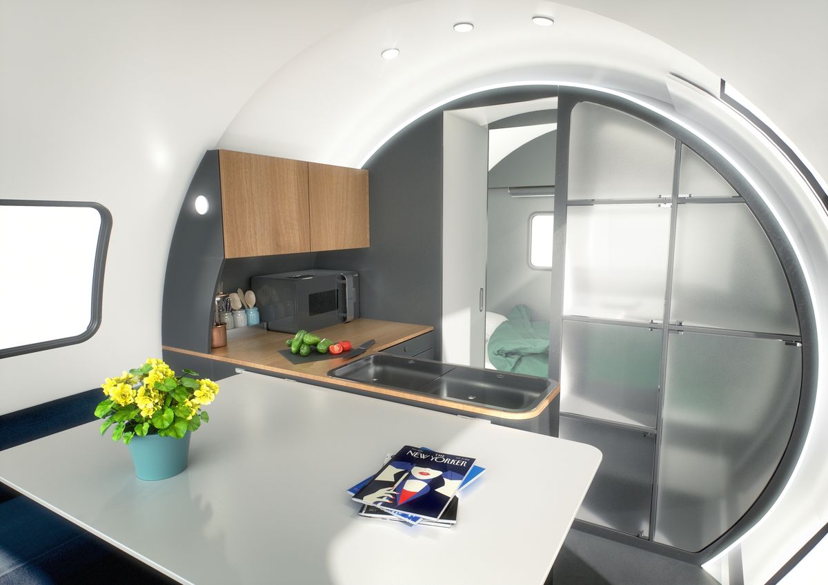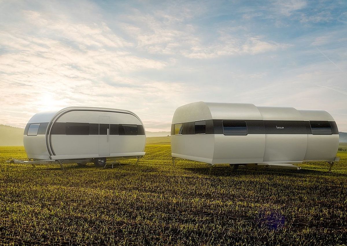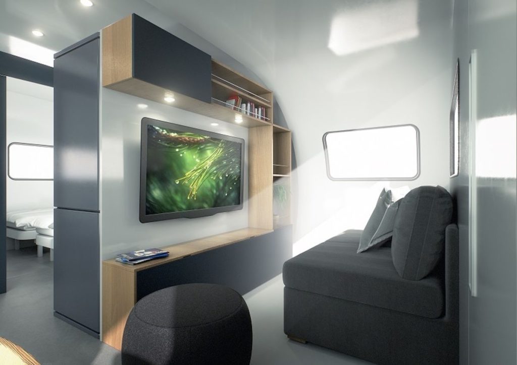 Das größere Modell 3X Plus bringt es sogar auf 28 Quadratmeter. Bis zu vier Personen können in den Caravans schlafen, zwei im Schlafzimmer und zwei im Wohnbereich, dessen Sitzgruppe sich zu einem Doppelbett umbauen lässt. Die Stellantriebe für den Auszugsmechanismus werden von Netzstrom oder Akkus versorgt.
