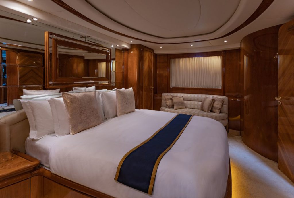 Die beiden Hauptkabinen und zwei Zweibettkabinen sind mit einer handgefertigten Inneneinrichtung aus Kirschholzpaneelen und italienischen Marmoreinlagen geschmückt.