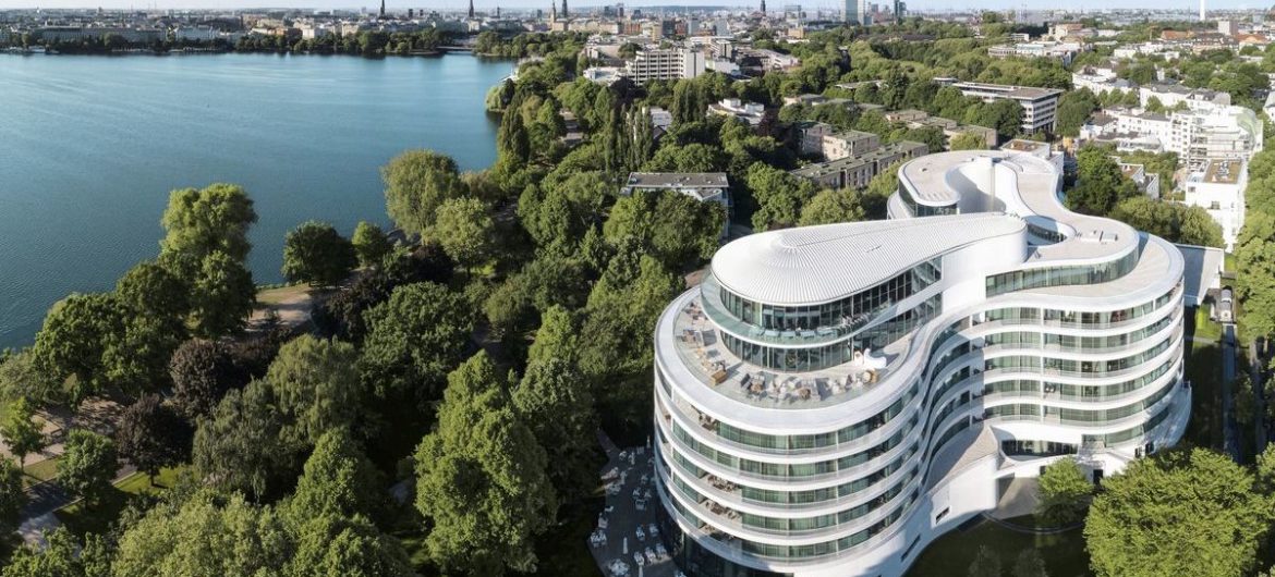 Die organische Architektur unterstreicht die Möglichkeiten im Haus. Denn das edle Hotel geizt nicht mit Superlativen, wie einem 27 Meter hohen Atrium, einem 1.000 Quadratmeter großen Spa und einem Infinity-Pool ohne Außenkanten, der mit der Alster zu verschmelzen scheint.