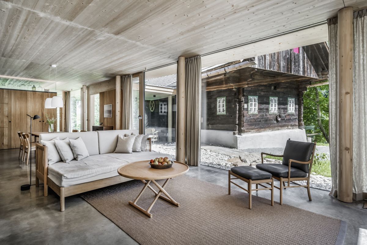 Materialien wie Holz, Stein und Leinen prägen das Interieur und bringen die steirische Landschaft in das Innere. Ein besonderer Blickfang sind dabei die hochwertigen Natursteinwände im Wohnbereich sowie in einem der Schlafzimmer.