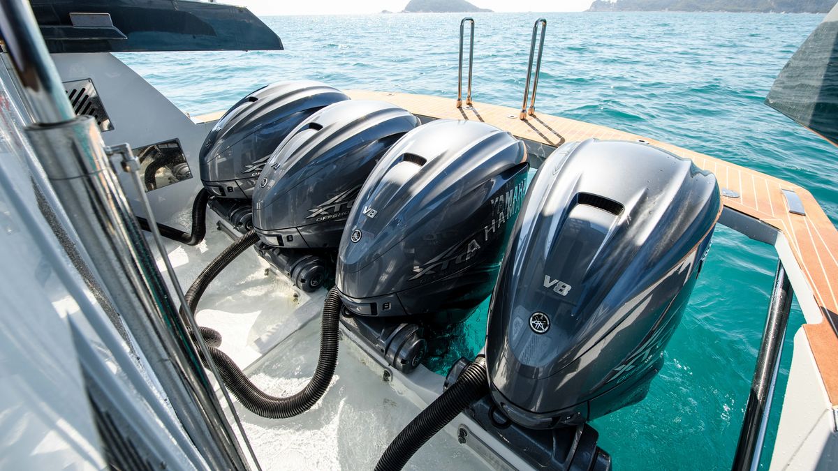 Und so montierte der Bootshersteller gleich vier Yamaha XTO 425 V8 mit je 312 kW an die Flybridge-Hochseeyacht – macht in Summe 1.700 PS.