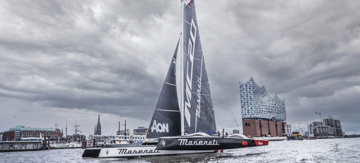 Der Hochsee-Trimaran namens Maserati Multi 70 hat unter der Führung von Profi-Skipper Giovanni Soldini bereits in vielen Gewässern gekreuzt. Jetzt sind der Italiener und die dreirümpfige Rennyacht erstmals auf der Elbe unterwegs – und machen in Hamburg fest.